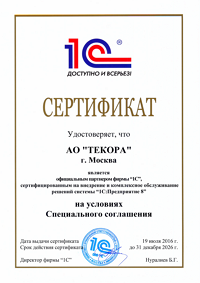Мы не стоим на месте, наши системы постоянно развиваются, улучшается их функционал. Мы изучаем появляющиеся технологии, следим за новыми ИТ-тенденциями, плотно взаимодействуем с нашими партнерами и вендорами, что позволяет нам всегда быть на пике технологий, чтобы предоставлять нашим клиентам оптимальные решения. Компания «ТЕКОРА» является сертифицированным партнером компаний 1С (Сертификат партнера фирмы "1С" от 19.07.2016), SAP, Microsoft.